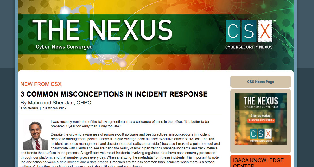 […] preserve business credibility and reduce financial damage. Helping insurance companies proactively mitigate these risks is RADAR, a patented SaaS-based incident response management platform that simplifies and streamlines compliance with federal and state data breach laws. “We are solving a valuable business problem by addressing the operational challenges the insurance providers face every day in […]